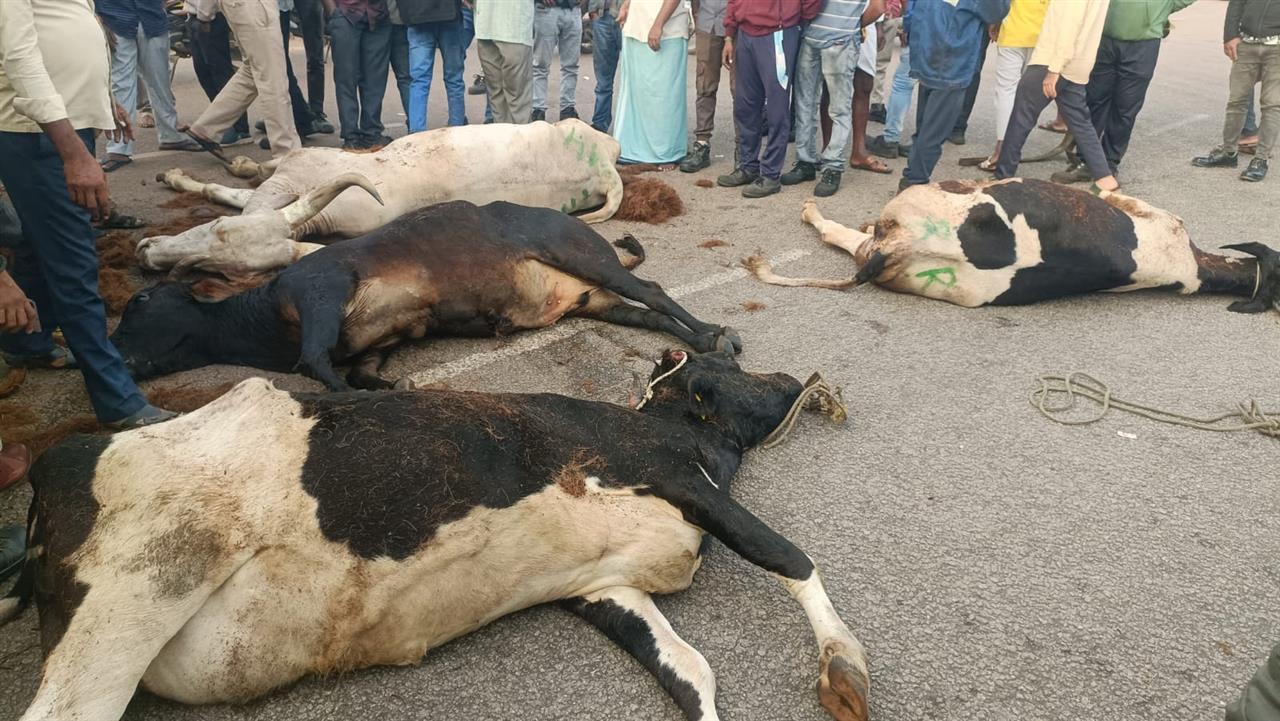 ಅಪಘಾತ ಕಾರಣದಿಂದ 6 ಗೋವುಗಳು ಮೃತಪಟ್ಟಿವೆ ಎಂದು ತಿಳಿದು ಬಂದಿದ್ದು ಬೆಂಗಳೂರು ನೋಂದಣಿಯ ಈ ಲಾರಿ ಮಹಾರಾಷ್ಟ್ರ ಕಡೆಯಿಂದ ಬೆಂಗಳೂರಿಗೆ ಹೊರಟಿತ್ತು. ಲಾರಿ ಚಾಲಕ ಪರಾರಿಯಾಗಿದ್ದಾನೆ.